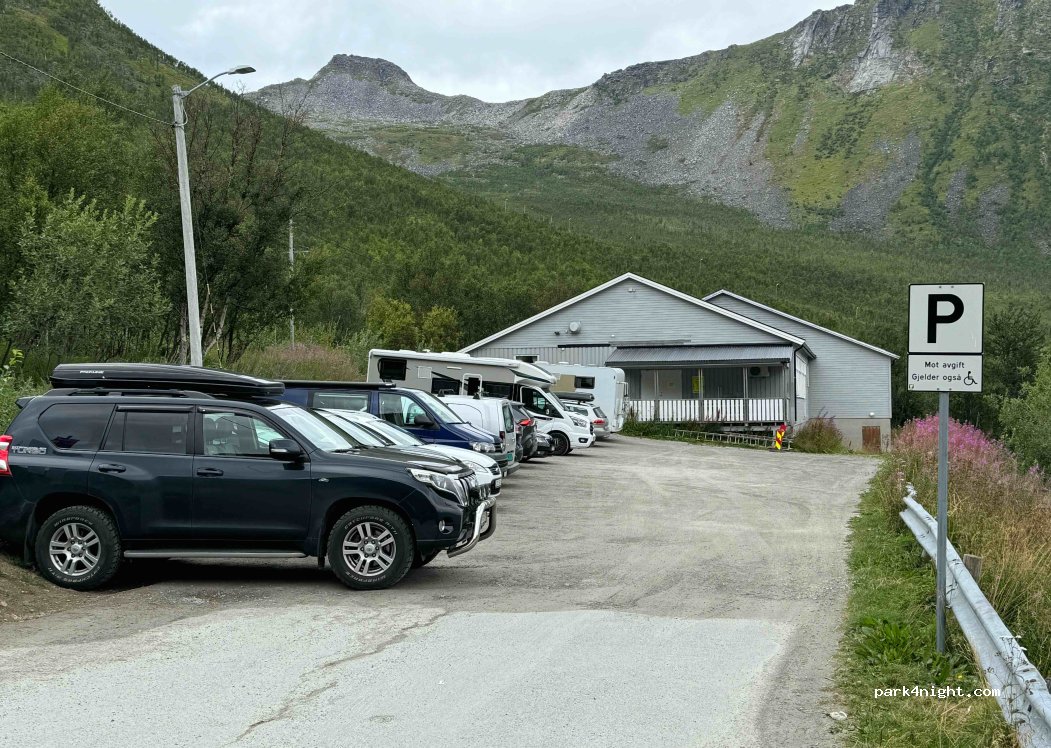 Tagesparkplatz mit öffentlichen Toiletten. Ausgangspunkt für Wanderungen zur Segla. Bezahlen Sie über die App.