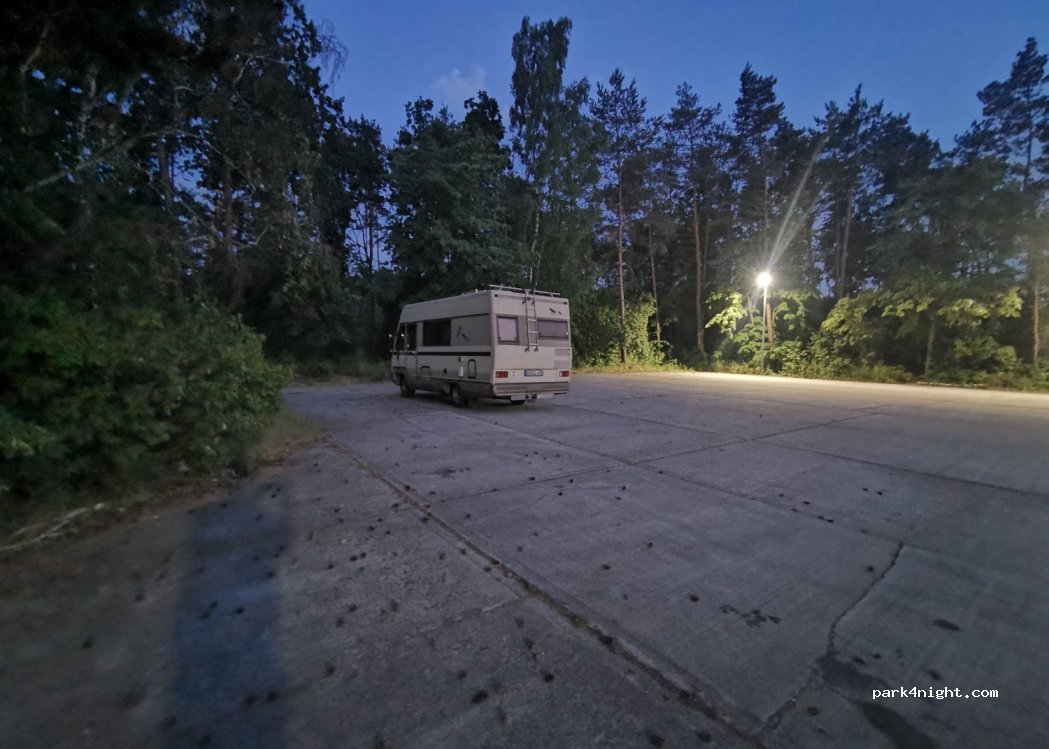 Für Übernachtung ok. Sehr ruhige Lage abseits der ausgebauten Bundesstraße. Beleuchtet und morgens schattig direkt am Betonierte Fläche relativ eben.