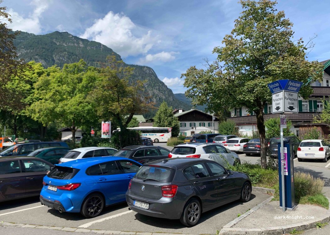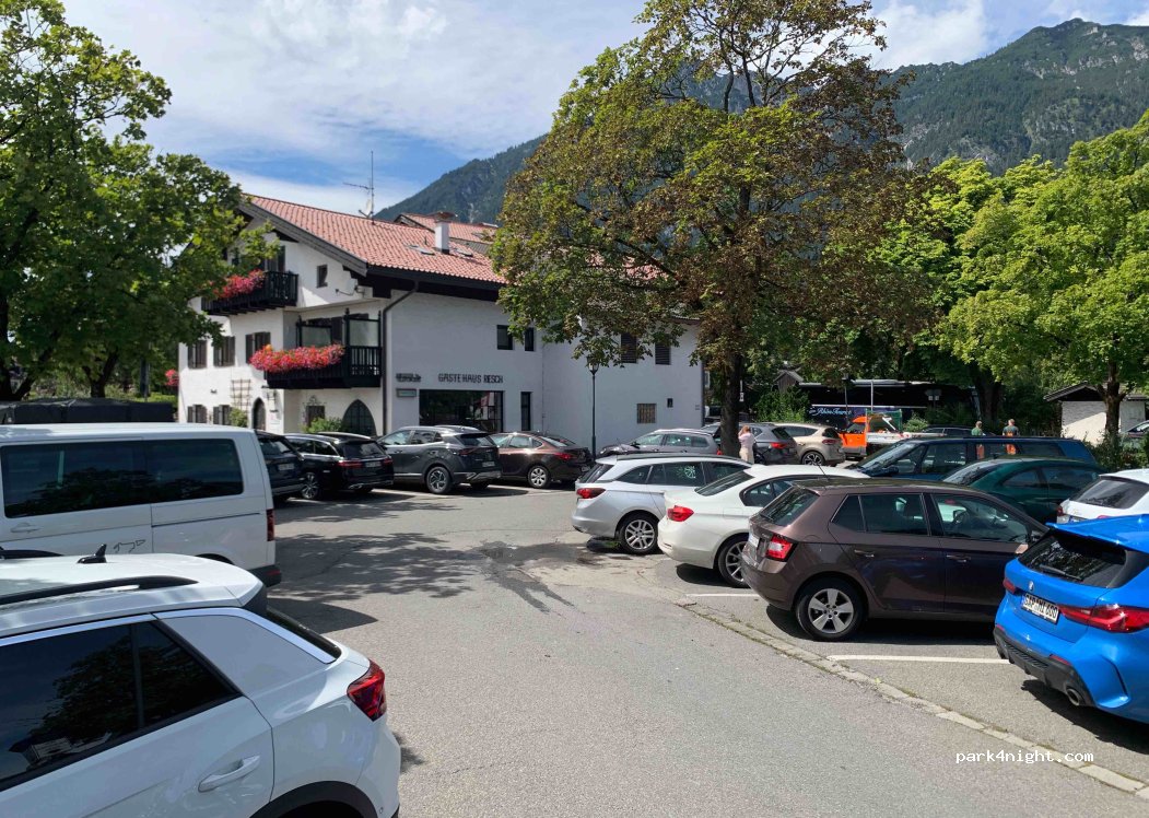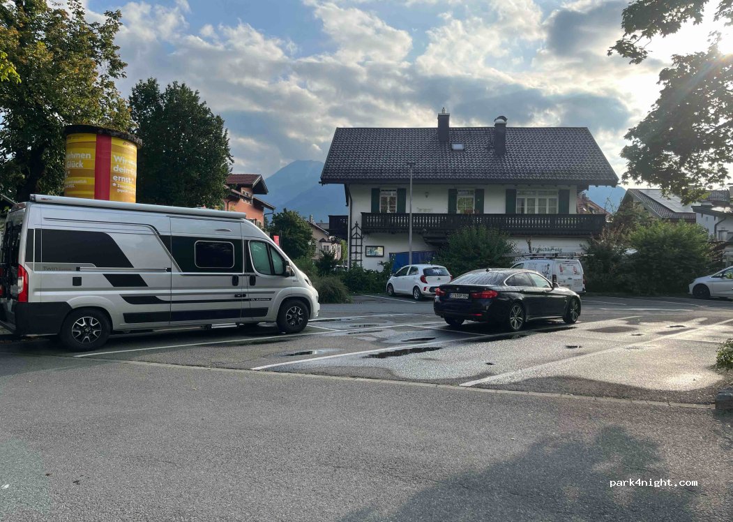 Mitten in der Stadt und wochentags kostenpflichtig. Wir waren in der Nacht zum Sonntag da und da kamen, beginnend ab 03:45 Uhr, irgendwelche eigenartigen Leute, die wohl irgendwas geraucht hatten, laut krakeelend und fuhren dann mit ihren Autos davon. Das zog sich etwa eine Stunde, dann wurde es wieder ruhig. Etwa 1km Fußmarsch zum Zugspitzbahnhof, wir heben das Auto gleich hier stehen gelassen.