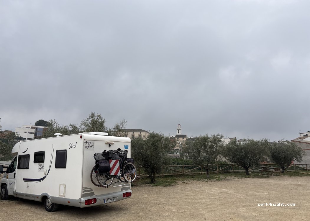 A quiet parking place with great views. The small town is very well kept with lots of interesting sundials. There are many trails through the olive, orange and nut groves. Well worth a stop. Thank you to the community for providing this service.