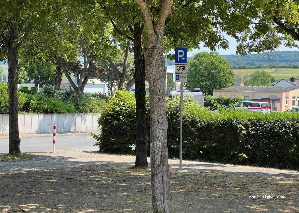Wohnmobilstellplatz im Zentrum von Wehrheim. 1 Stellplatz auf Kies, unter Linden, gut beschattet. Feuerwache und Restaurant nebenan. Maximale Parkzeit 12 Stunden.