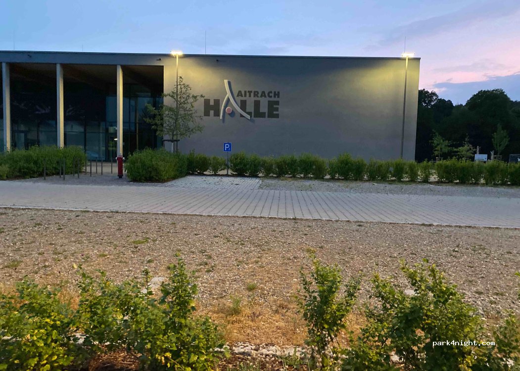 Gymnase et salle de sport Aitrach. Parking calme avec lumière. Passé une nuit très calme. Les enfants de l'école primaire sont amenés le matin. Il y a une boulangerie en ville.
