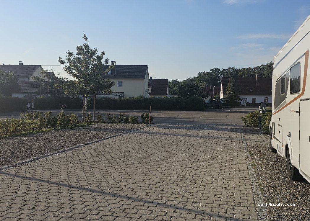 Gym and sports hall Aitrach. Quiet parking lot with light. Had a very quiet night. Elementary school children are brought in the morning. There is a bakery in town.