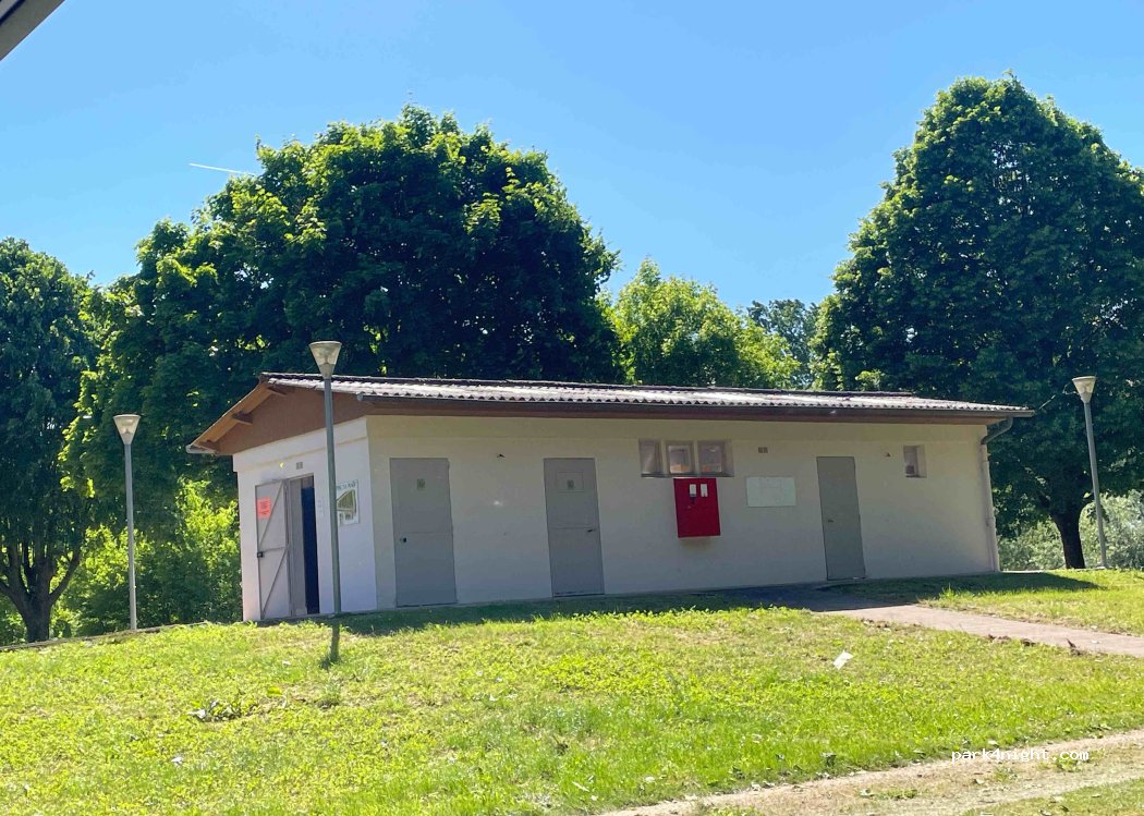 Benötigt wird eine Camping-Car-Park Karte. Der Sanitärbereich am Fluss ist nich zu benutzen. Es gibt einen etwas besseren in der Mitte des Geländes. Alles nicht sehr einladend. Falls sie in das benachbarte Schwimmbad möchten (3.50€) denken sie daran: es sind nur enganliegende Badehosen erlaubt, damit sie nicht zu viel Wasser aus dem Becken transportieren. Für eine Nacht OK. Das war es dann aber.