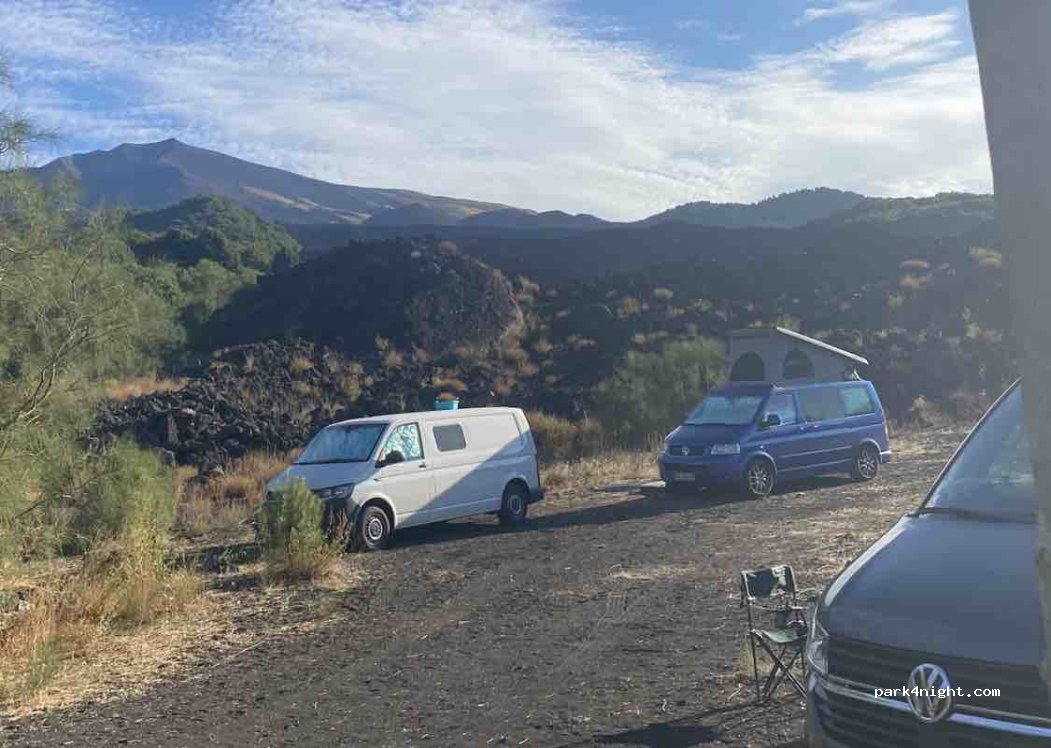 Accueil très sympathique de la propriétaire. Grotte volcanique accessible à 10 minutes à pied. Emplacement au calme dans un lieu magique, eau à disposition mais la douche est froide avec très peu de débit. Ce camping "roots" se situe proche en voiture du départ pour l'Etna. Nous conseillons le bureau des guides de la compagnie AITNE que nous avons grandement apprécié. Belle soirée à 1400 m.