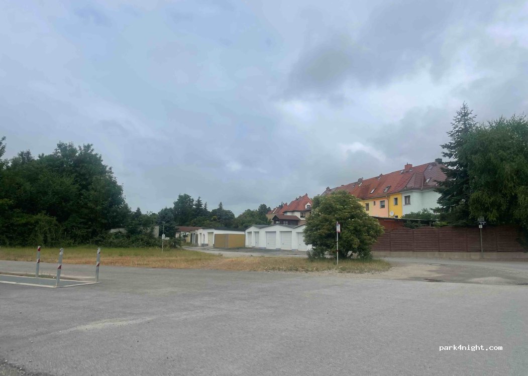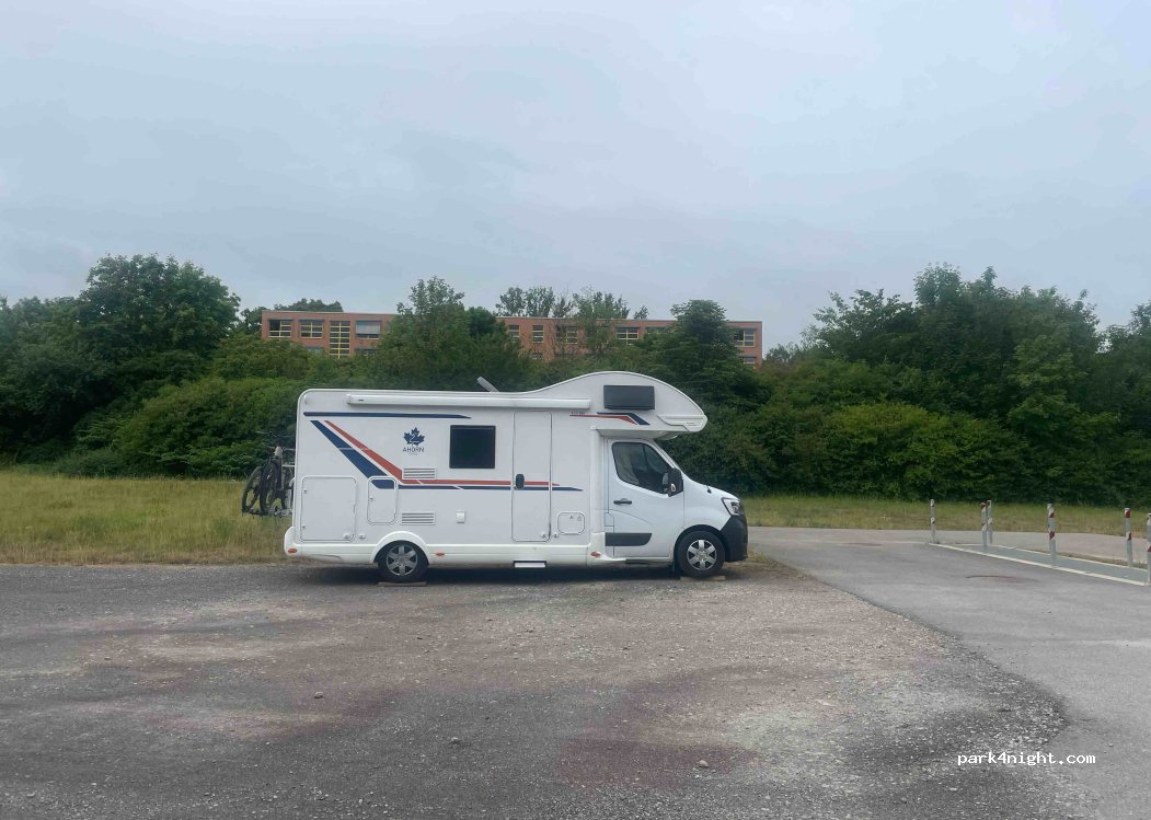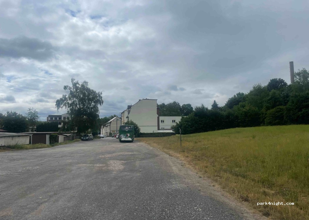 Ein Platz in Parknähe auf der Rückseite der Häuser. Wenig Verkehr. Abends ein paar Radfahrer und früh ein paar Leute die auf Arbeit fahren. Viel Platz auch für größere Fahrzeuge. Ein großer Park ist in der Nähe und dahinter ein Freibad. Einkaufsmöglichkeiten in der Innenstadt 20 Minuten zu Fuß.