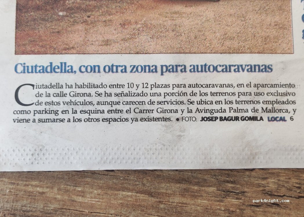Buen aparcamiento para pernoctar, lavandería a 4 minutos, panadería a 3 minutos, cubos de basura a 1 minuto, parque infantil también con canastas de baloncesto (Plaça Joan de Borbò) a 6 minutos.