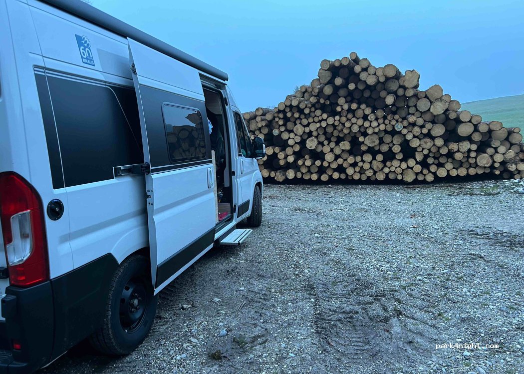 1 bis 2 Nächte okay. Wo wir stehen, ist heute Kieslager und BäumenstammLager gestanden. Aber ruhig und gute Möglichkeit zum radel fahren und wandern. Liebe Grüße von K.O.B