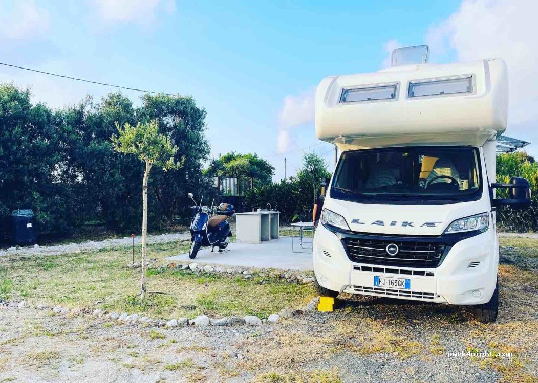 Piazzole comode organizzate con piano di lavoro e lavandino con acqua corrente. Bagni nuovi e dotati del necessario. A pochissimi minuti in bici da spiagge e attività commerciali. Si sosta affianco a orti di pomodori e piante di avocado e mango. Contesto tranquillissimo e comodo da raggiungere usciti dall'autostrada.