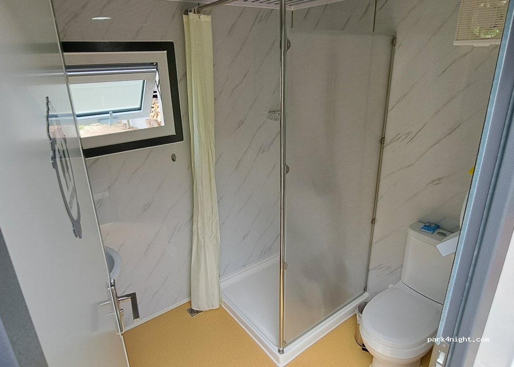 SP m.WC u. Dusche. Alles sehr sauber und neu. Strom u. Fäkalentsorgung vorh. KEIN Bodeneinlass f. Grauwasser vorh.Rasenuntergrund. Mülltrennung vorh. Nachts sehr leise!!!! Bezahlmögl.Briefkasten. Hat uns sehr gut gefallen.