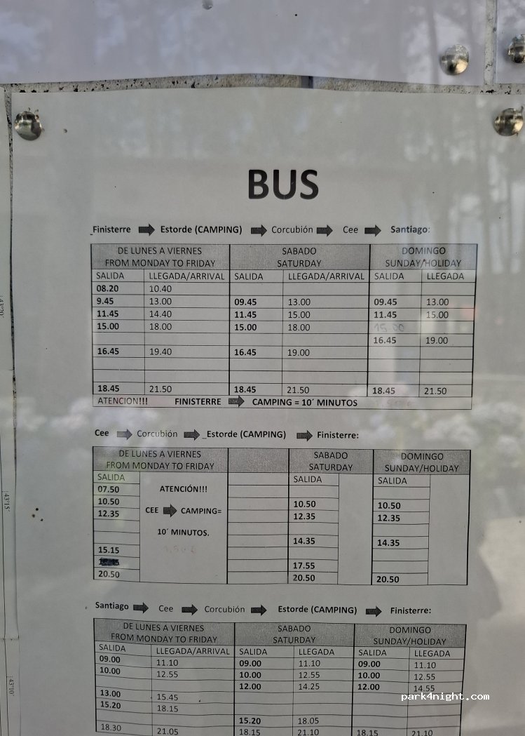 va bene per una notte. ci sono molti alberi quindi difficile entrare e uscire con camper più lunghi di 6 metri. i bagni sono abbastanza puliti. è vero che c è l autobus che porta a finisterre ,ma ha pochissime corse quindi non sempre eè possibile prenderlo. pagamento solo in contanti