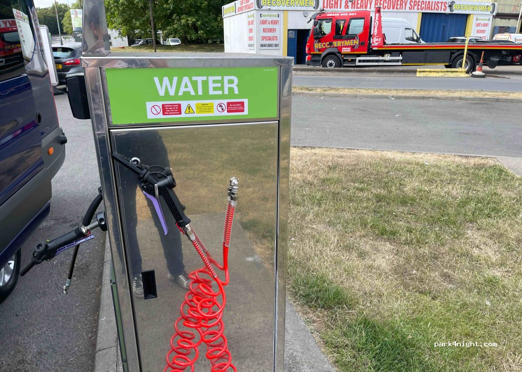 Welcome Break services off M1 northbound. Water but not for drinking. Useful for filling water tank. Rather slow!