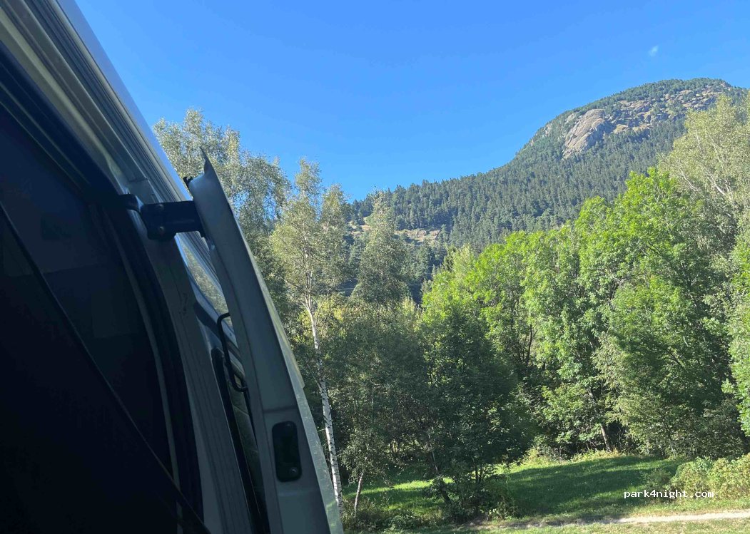Très calme pour une nuit. Pas de vue sur les montagnes mais à l’abri du vent. Espace herbeux et plat avec barbecue.