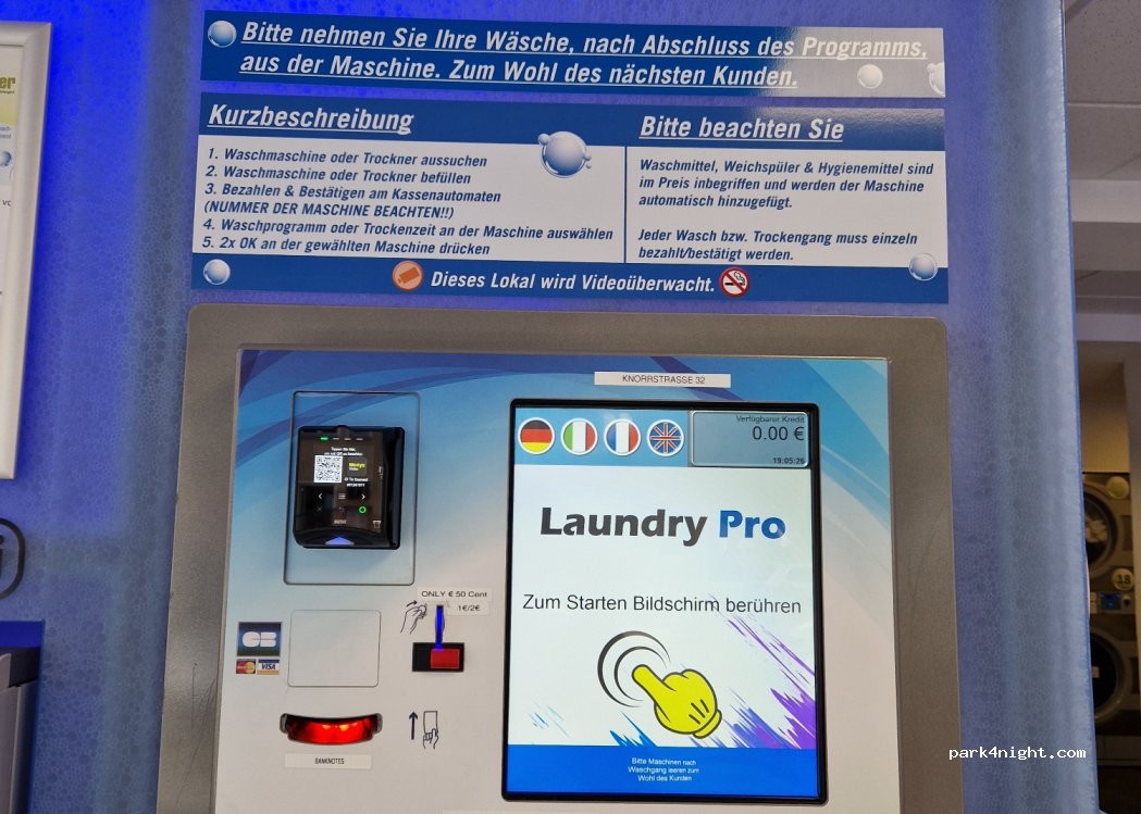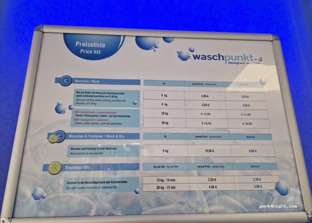 I wish I’d read the previous comment before. The wash and dryer doesn’t dry properly. The detergent is included, smells neutral. It’s Sat and parking on the street was busy but possible. Laundry was full, too, but there are many machines and people are fast. 1h15 the whole process. 6kg 4€ / 8kg 5,5€ / 20kg 13€ / 30kg 18€ / dryer 2,50€ 15min there is WiFi and enough seats.