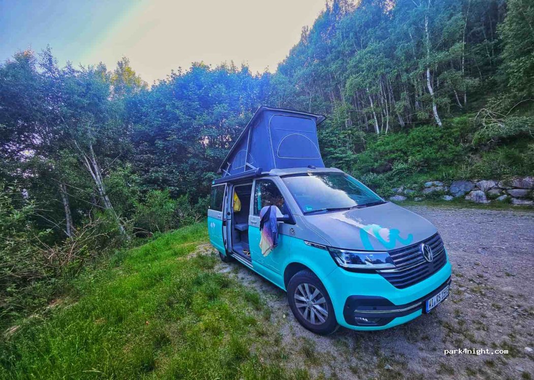 Sehr steile, enge Auffahrt. Nur für Vans geeignet. 3€ pro Tag am Automat bezahlen; völlig ok. Leider sind die Birken inzwischen so hoch, dass man den See nicht mehr sieht. Parkplatz total ruhig. Eben. Bitte sauber halten! Idealer Ausgangspunkt für Bergtouren oder MTB.