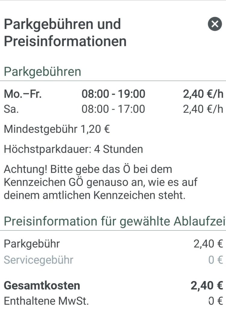 Mit 699m haben wir hier einen Parkplatz gefunden. Parkgebühr 2,40 Euro pro Stunde