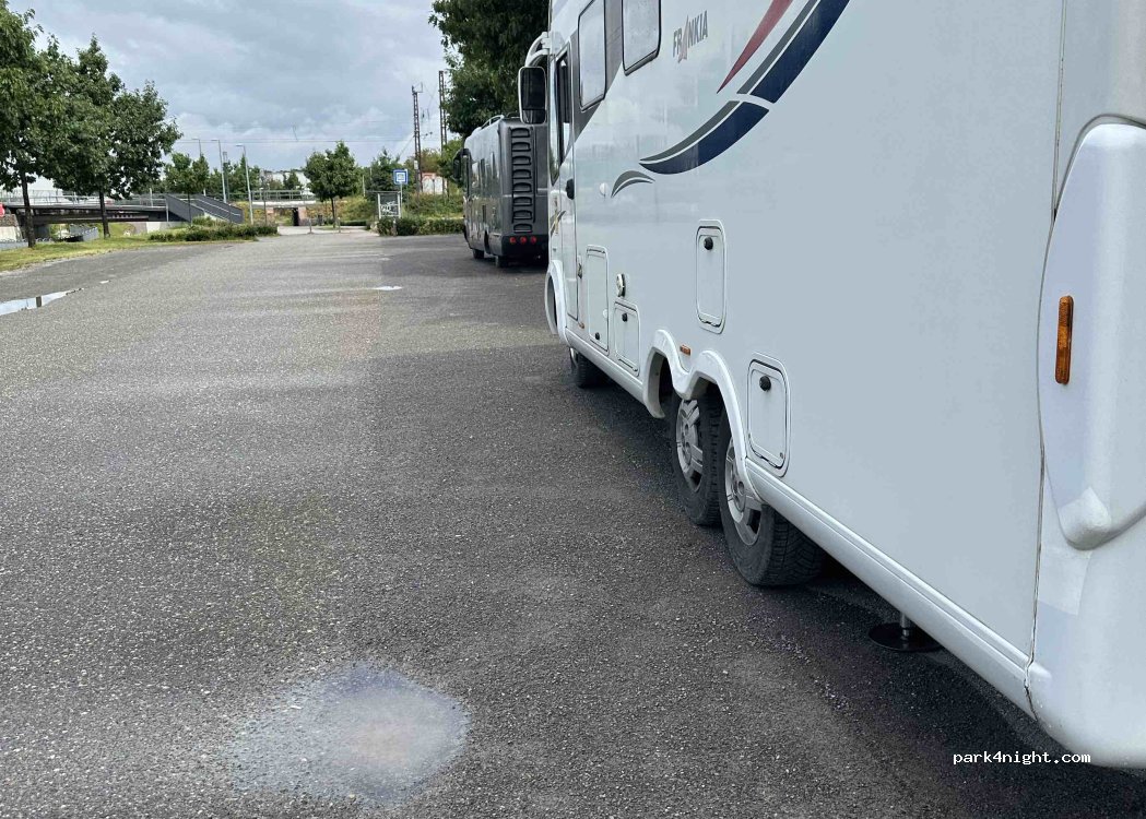 Gute Ausweichmöglichkeit wenn der Womo Stellplatz nebenan voll ist. Güterzüge fahren in der Nacht vorbei, für uns aber nicht störend gewesen. Viele Laternen, für eine Übernachtung völlig in Ordnung.