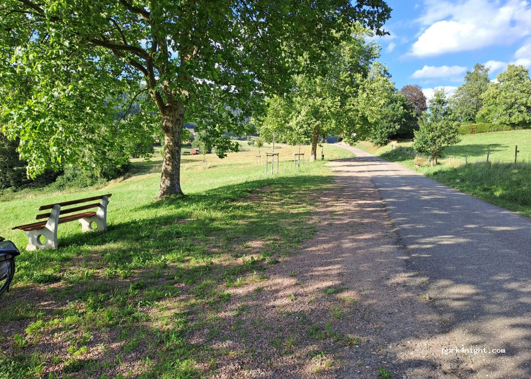 Aussichtreicher Platz im Grünen zum Parken, ca. 100m neben einem Friedhof an einer ruhigen Nebenstraße ausserhalb einer Ortschaft. Mit einzelnen Sitzbänken und einem Mülleimer. Die naheliegende Landstraße ist hörbar.