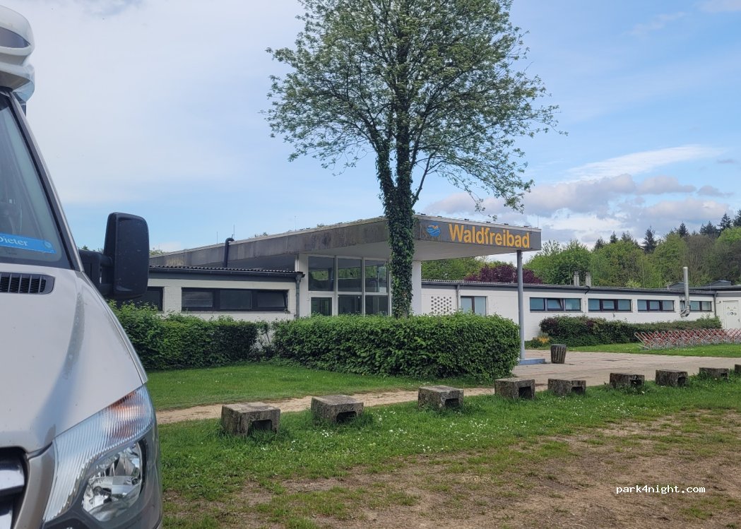 Parkplätze am Waldfreibad. Schön gelegen für Wandern oder Radfahrer. Duschen sind im waldfreibad. Der Tages Eintritt ins Freibad liegt bei 3.50 Euro