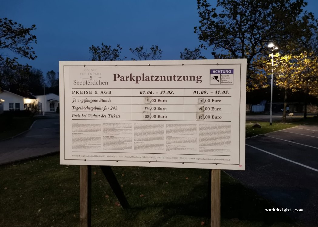 Este parking forma parte de un complejo vacacional, pero es (además de señalizado) un parking público y accesible para todos. Las plazas de aparcamiento son un poco estrechas (6 m es suficiente). El solar se encuentra en una zona residencial compuesta principalmente por casas de vacaciones y relativamente tranquila. No hay tráfico ni ruido de trenes. Sacas una multa de estacionamiento y la barrera se abre. El pago se realiza a máquina. La facturación es por horas, con un precio máximo de entrada de día de 8 euros (verano 2023). No hay instalaciones de suministro o eliminación.