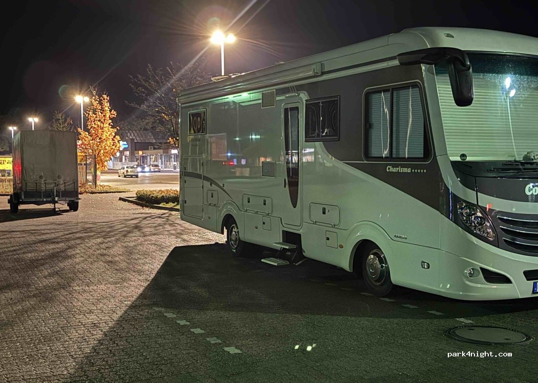 Parking lot next to the B189. You can hear the road. In the parking lot there is a McDonalds from 7am to midnight, and an Edeka and Aldi from 8am to 8pm. No problem staying overnight in a motorhome without camping.