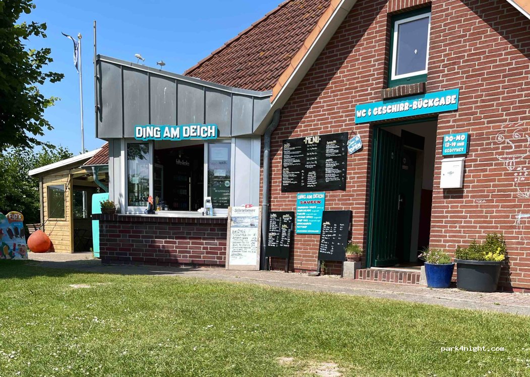 Hola, ¿qué bien podemos hacer por ti? Somos DING AM DEICH, un restaurante de playa con plaza de aparcamiento para casas móviles, alquiler de sillas de playa, pista de vóley playa y parque infantil justo en la zona de baño de Elpersbüttel. ¡Ven aquí y siéntete cómodo con nosotros!