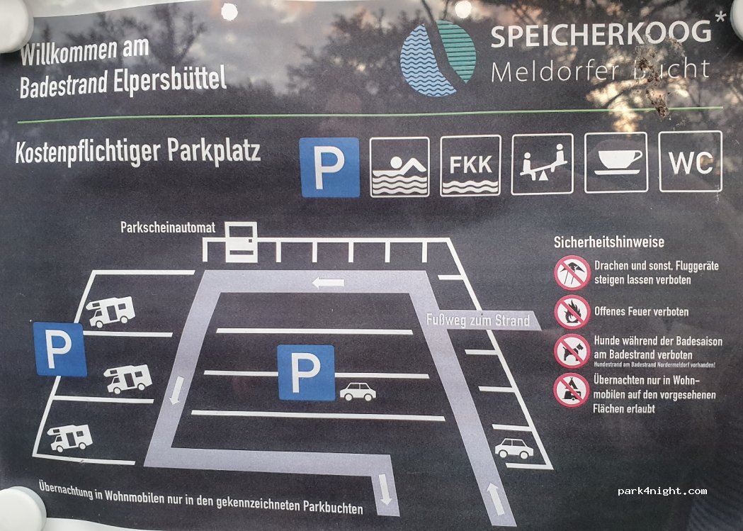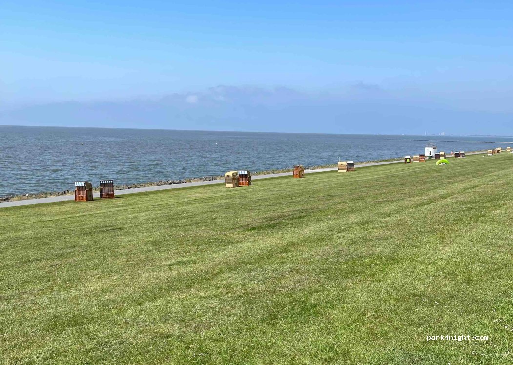Schöner ruhiger Parkplatz am Deich. 15 Euro für 24h. Die Mitarbeitende im Ding am Deich Bistro sind super freundlich. Wir haben uns sehr wohl gefühlt. Es gibt leckeres Essen. Toiletten sind 24/7 geöffnet. Achtung für Hundebesitzer:innen: Hunde sind während der Badesaison bis 30.9 nicht am Deich erlaubt, ansonsten nur kurze Leine. Nichts desto trotz hätten wir einen schönen angenehmen Aufenthalt.