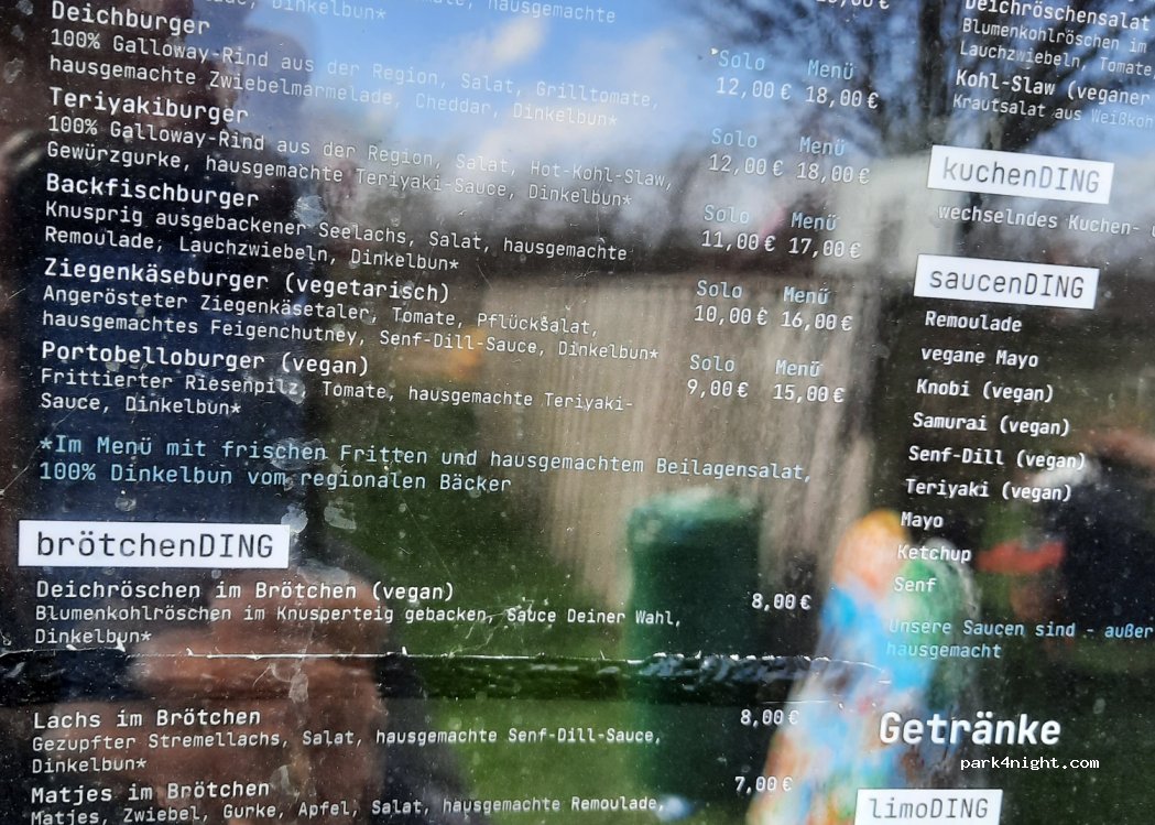 Ciao, cosa possiamo fare per te? Siamo il DING AM DEICH, un bistrot sulla spiaggia con parcheggio per camper, noleggio sdraio, campo da beach volley e parco giochi proprio presso la piscina Elpersbüttel. Vieni qui e mettiti comodo con noi!