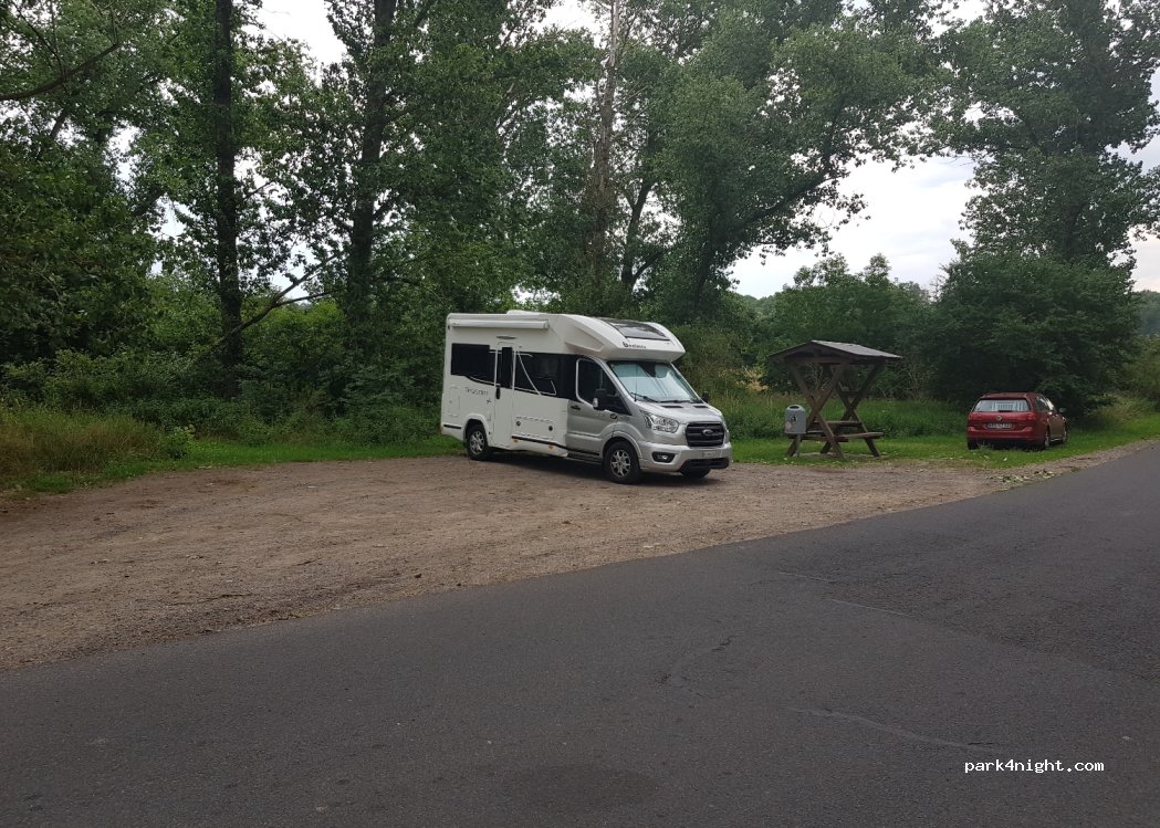 Platz am Rande einer wenig befahrenen Straße mit Picknicktisch und kleinem Mülleimer