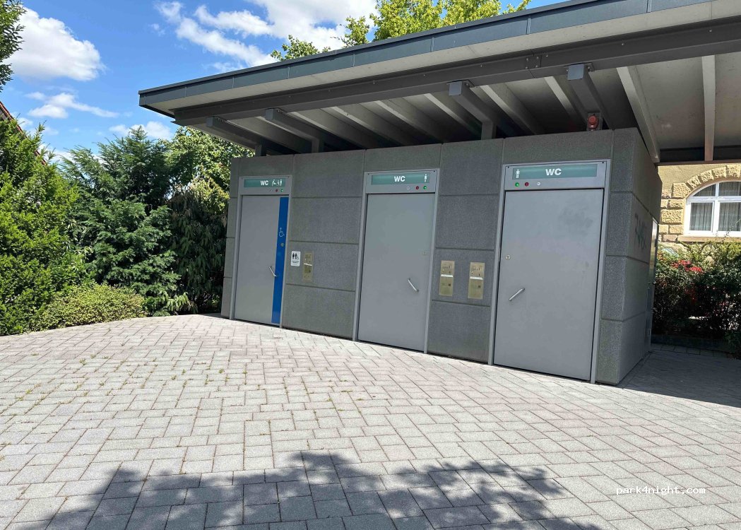 Direkt vor der Bushaltestelle! Saubere öffentliche Toiletten.