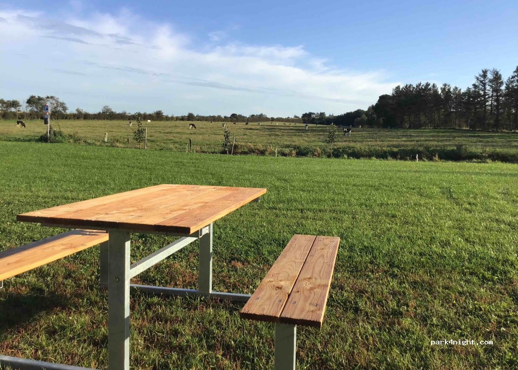 Placement très au calme. D'un côté vue sur la ferme, de l'autre prairie et forêt. 2 tables de pique nique sont disponibles. Gratuit juste pour se poser, 5 euros si eau et elec.