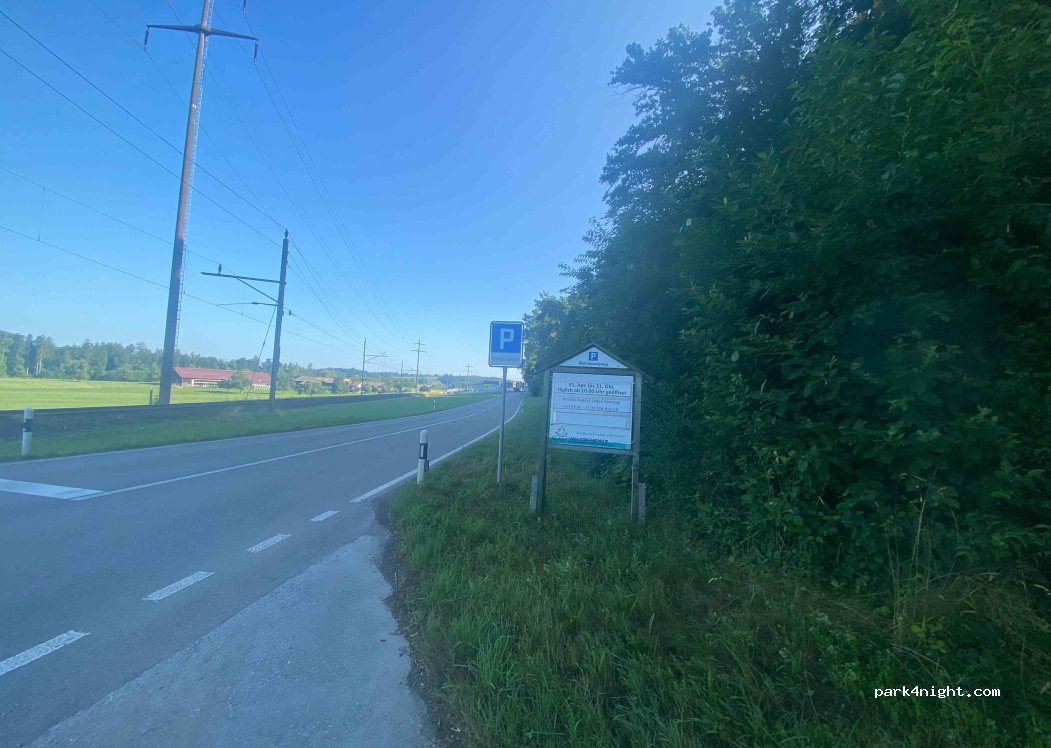 Parkplatz mit Picknick Tisch. Gleich nach dem Bahnübergang an der Hauptstrasse. Ab 06:00 Uhr Autoverkehr. Glocke des Bahnübergangs, der Barriere ist gut hörbar.