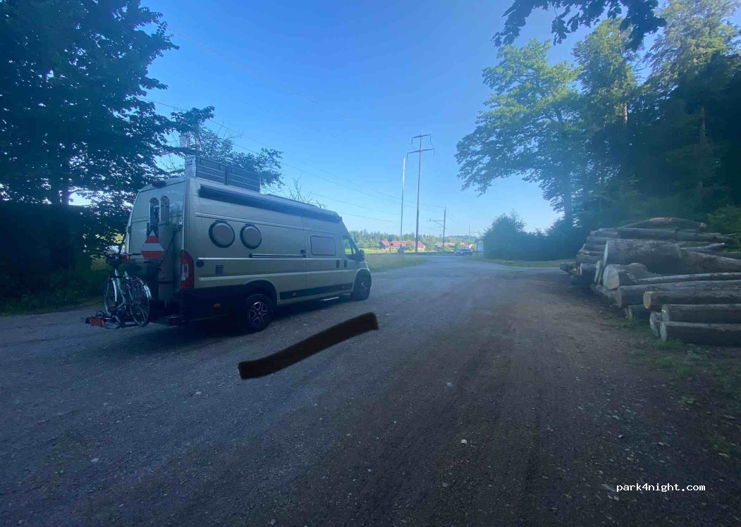 Parking lot with picnic table. Immediately after the level crossing on the main road.