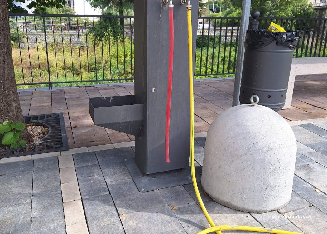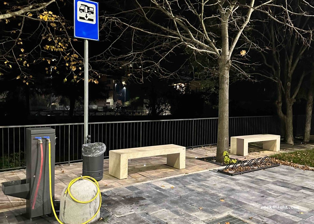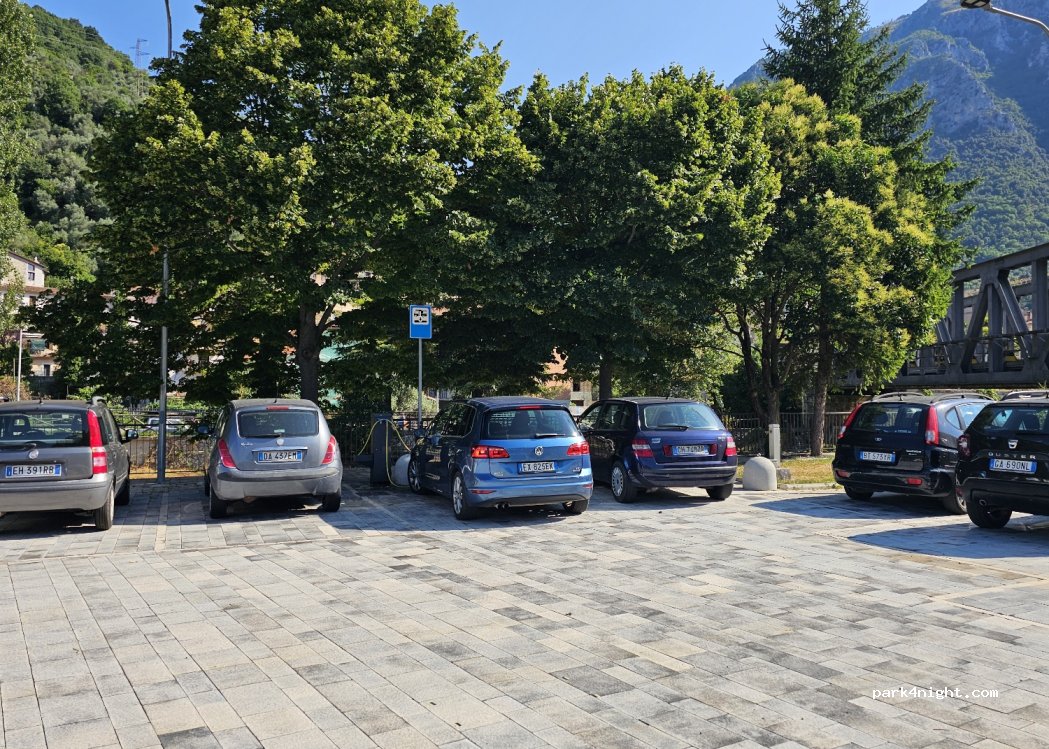 Area pianeggiante su autobloccanti di recente costruzione, vicina alla ferrovia ma senza frequente passaggio di treni, a due passi dal centro e adiacente al torrente. Ci sono due prese 220V con due stalli camper adiacenti, più altri stalli senza corrente. Presente carico acqua (attenzione perché ci sono due tubi identici e potrebbero essere usati sia per caricare sia per lavare il WC…), scarico acque (bisogna fare qualche manovra per riuscire a scaricare mirati sulla griglia).
