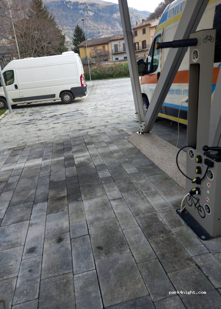 Electricity not working 8 Dec '25. Nice, modern parking area for two motorhomes up to 7m. Spacious, but depending on your direction of approach, there are two hairpin bends that long vans will struggle with. Water facilities work, but all are attached to the WC dump so you can be sure hygiene is a problem. Antrodoco is a cute village.