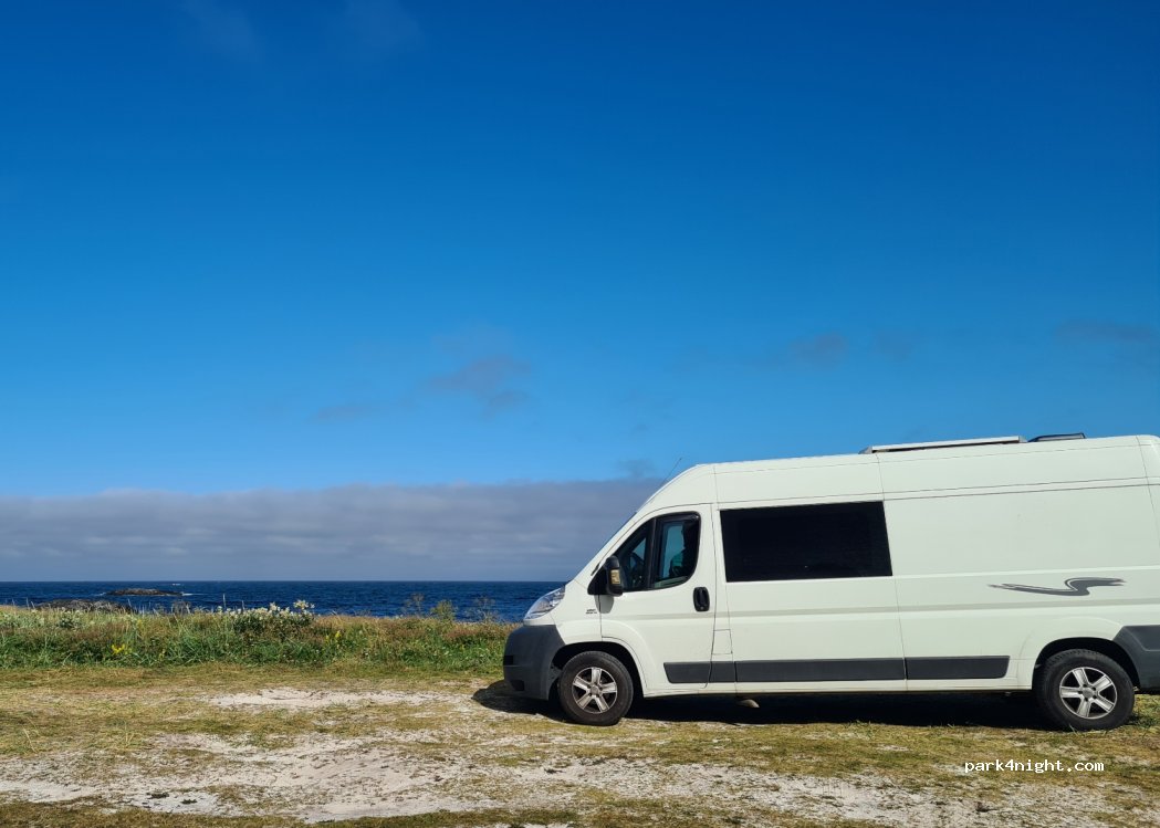 Lugar pequeño, 2 furgonetas como máximo, justo al lado de la carretera. Bonita vista y en una playa.