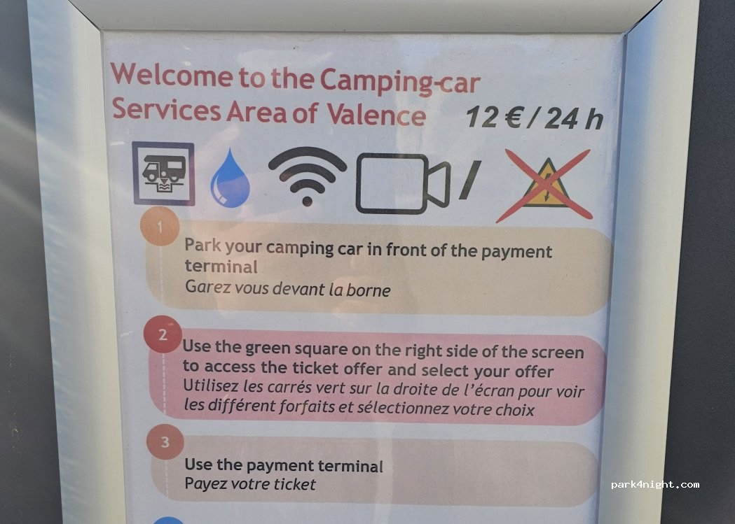€12/24h. Nette plek, ruimte om je wc en grijs water te legen. Valence fiets je in 5 minuten naar toe, de moeite waard om deze groene stad te bezoeken. Wij bleven overdag om in de nacht weer verder te reizen.