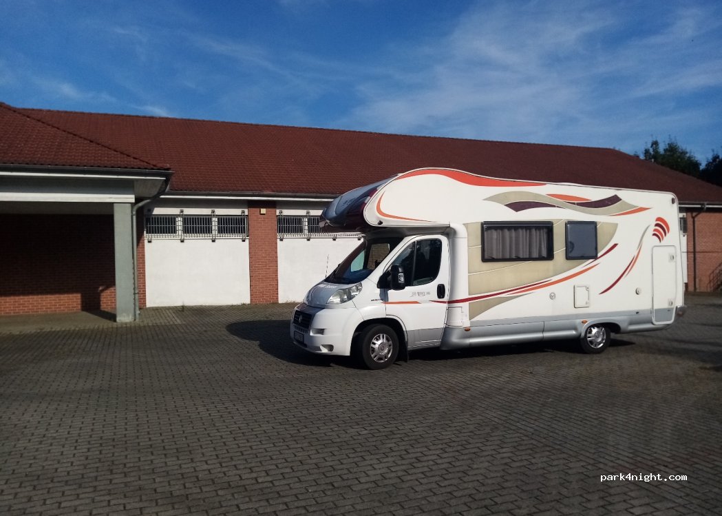 Großer Parkplatz auch für Wohnmobile, dort sichtbares Verkehrsschild, nur zum Parken ohne Service.