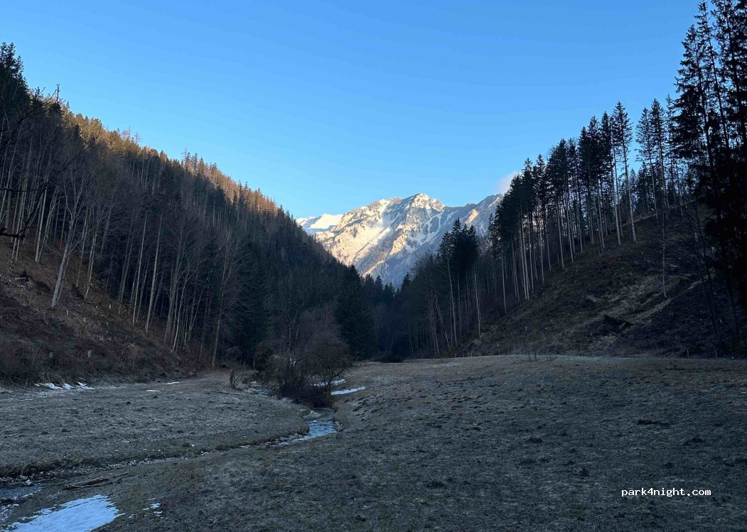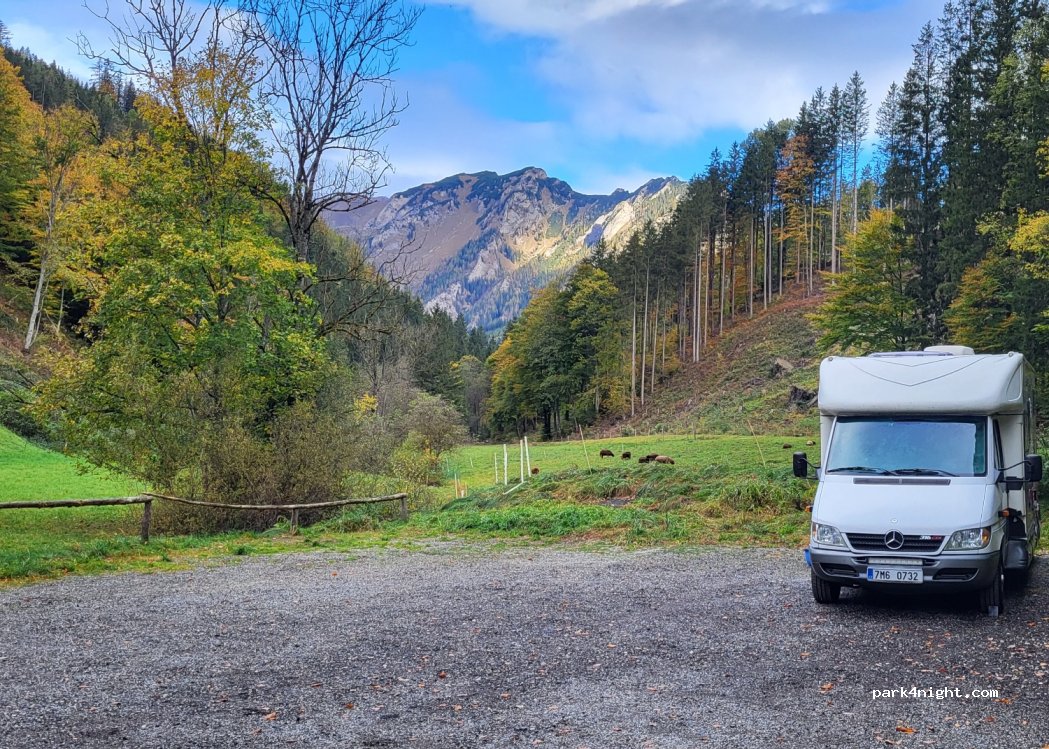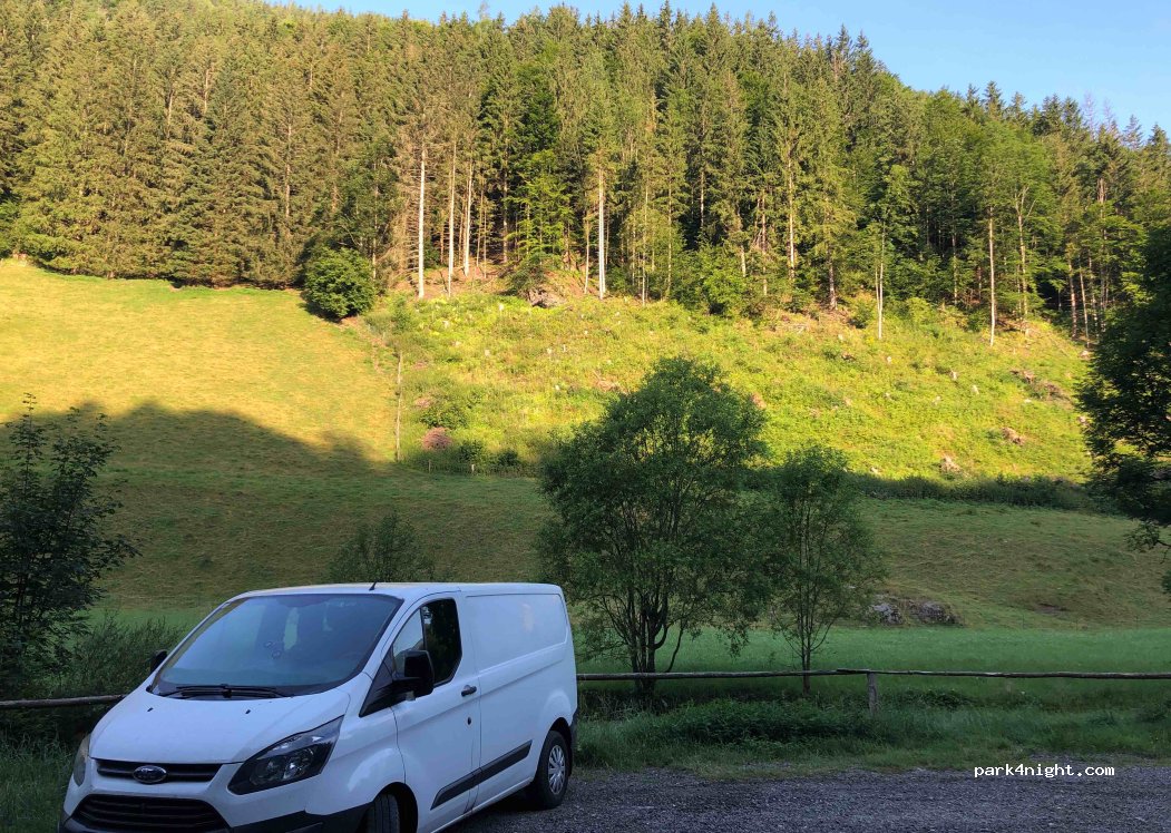 Beau parking calme à côté du ruisseau. Pas de panneaux d'interdiction ! Bon point de départ pour des randonnées !