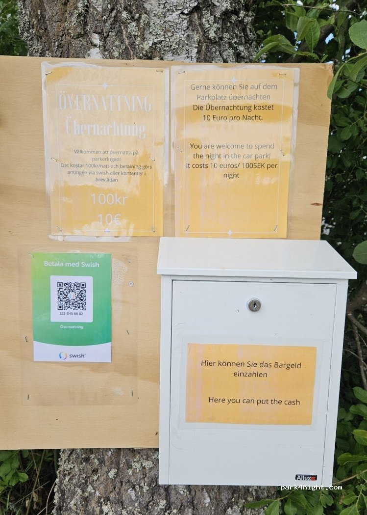 Man kann mittlerweile für 10€/100SEK hier übernachten. Es gibt einen Briefkasten am Schild zum bezahlen. Tagsüber steht man weiterhin kostenlos