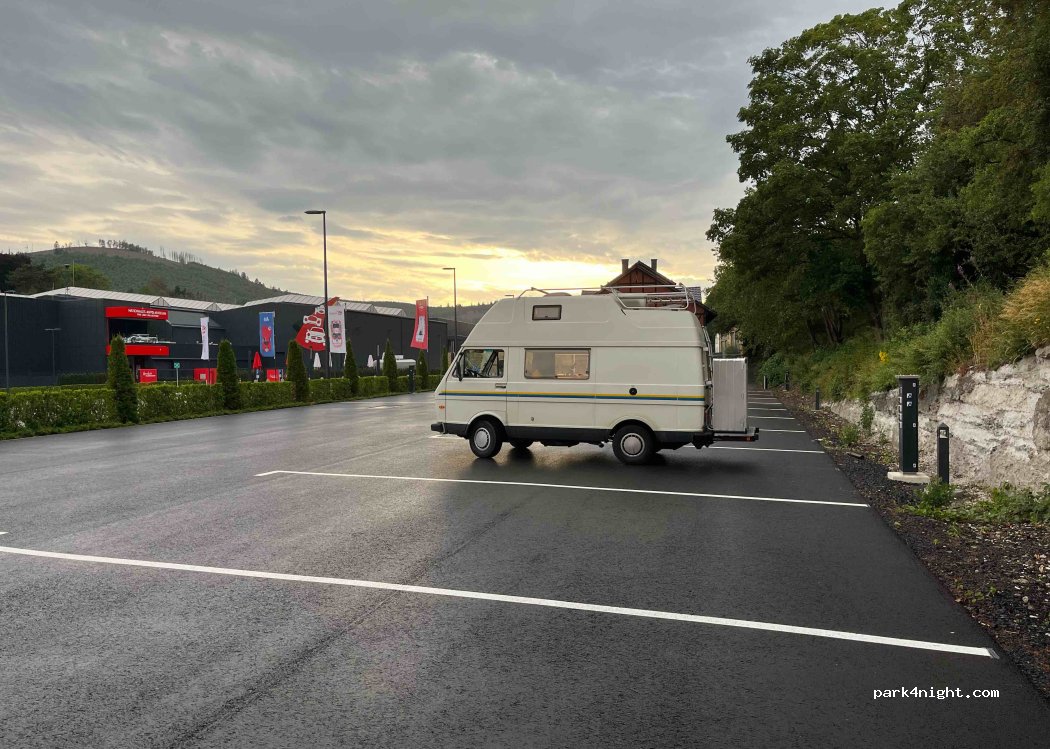Although it is very expensive (I payed 16€ for one night), you might like the museum. Loads of classic cars, but entry is equally expensive (25€ for both exhibitions). Electric, water etc. is at extra costs. Wifi was good and free but did not reach the inside of my truck.