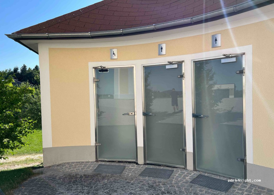 Left next to the church "Maria Schnee". Modern, clean toilets. Bench and trash can. Approx. 80 m away there is a large, shady children's playground with a few benches and even a tennis table. Then a country house.