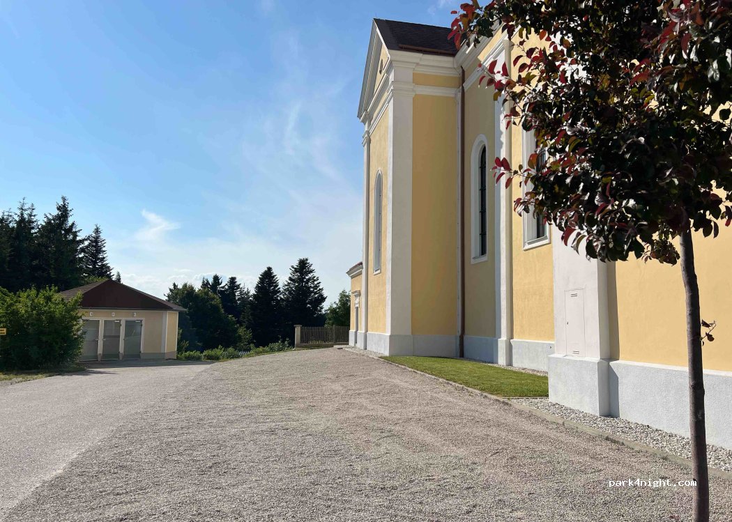 Links neben der Kirche „Maria Schnee“. Moderne, saubere Toiletten. Bank und Mülleimer. Ca. In 80 m Entfernung gibt es einen großen, schattigen Kinderspielplatz mit einigen Bänken und sogar einer Tischtennisplatte. Dann ein Landhaus.