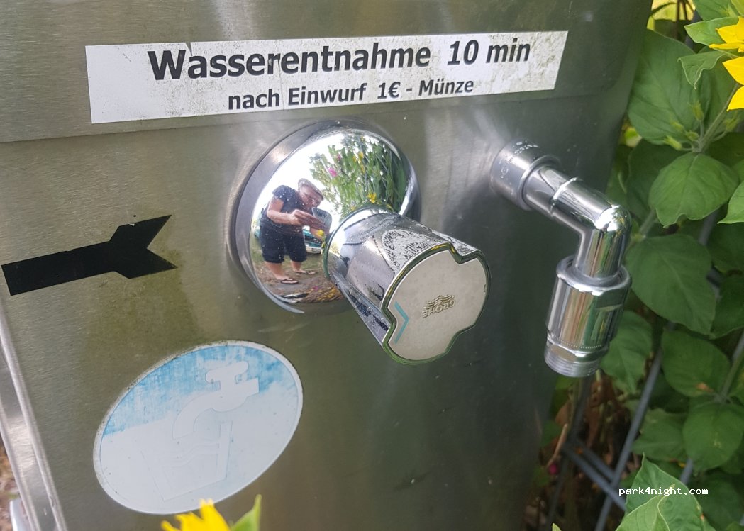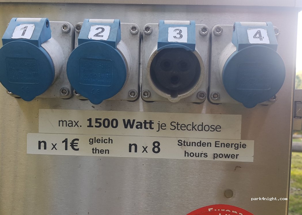 Il y a 4 prises (probablement parce qu'il y a de la place pour deux petits véhicules ensemble sur le grand parking ?) et l'eau peut être tirée de 2 robinets pendant 10 minutes pour 1 €. L'évacuation des toilettes ou des eaux grises n'est pas possible.