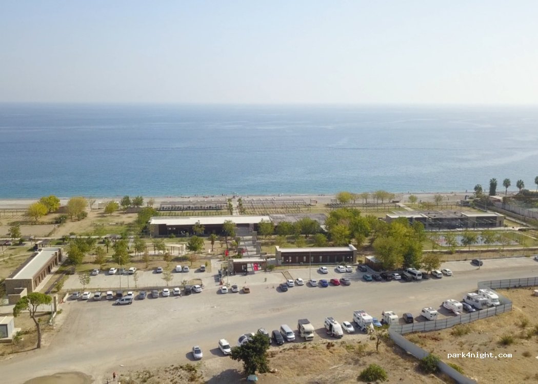 The place is in the Camyuva Halk Plaji complex parking lot, but they allow campers and caravans for only 500TRY, they offer electricity, they have showers and toilets, they also have a fast food/restaurant
