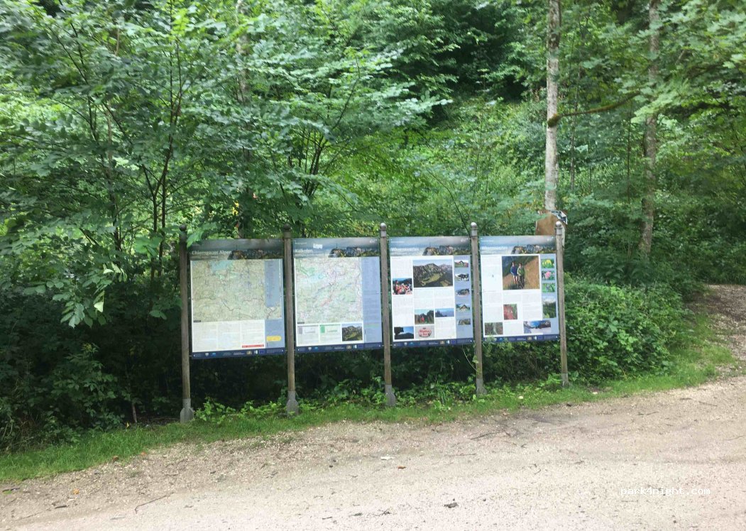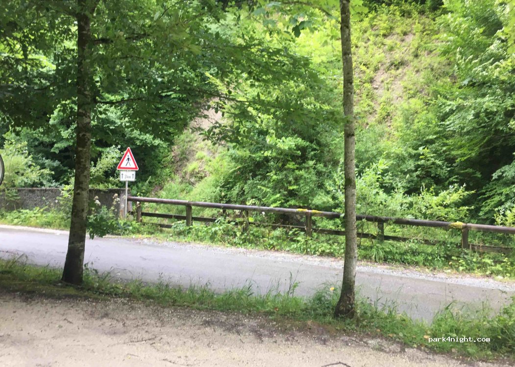 Parkplatz für 10-15 Fahrzeuge im Tal eines Waldes. Am Parkplatz vorbei führt eine wenig befahrene Straße mit dahinter fliesendem Gebirgsbach. Die Plätze sind eben bis leicht schräg. In der Nacht sehr ruhig. Ab den Morgenstunden füllt sich der Parkplatz mit Wanderern.