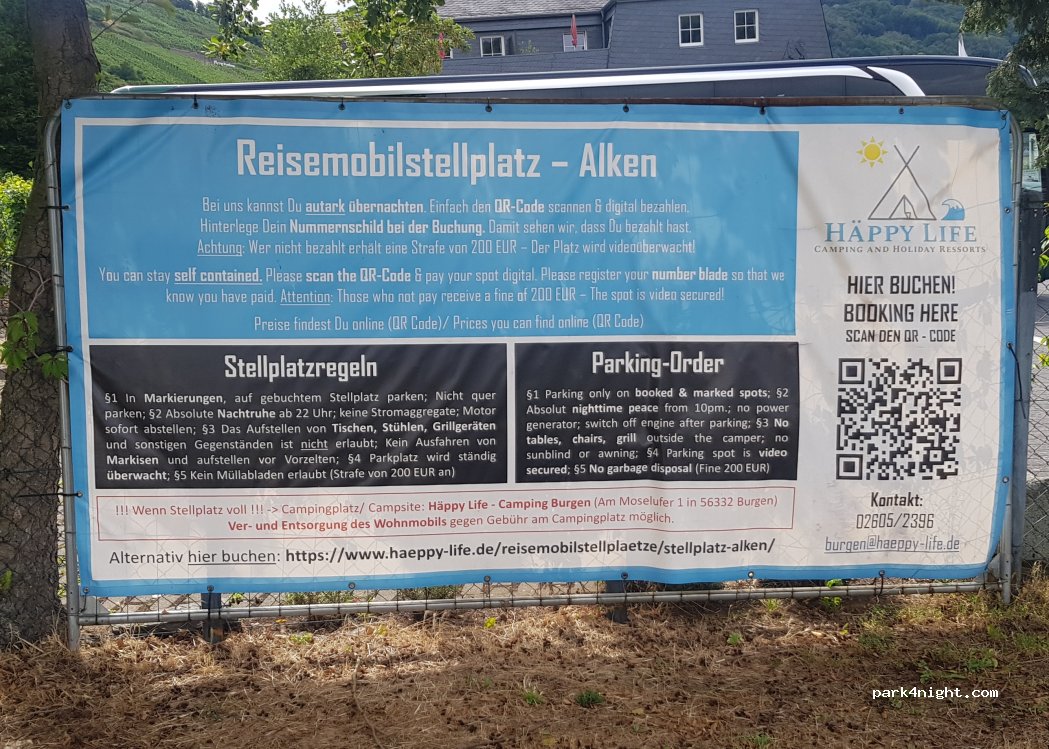 Cette petite aire de stationnement goudronnée pour camping-cars est située à la sortie du village d'Alken. Elle est séparée de la Moselle par un parking et la route très fréquentée menant à Coblence. Une supérette et une boulangerie se trouvent à 100 mètres. Un accès Wi-Fi public est disponible.