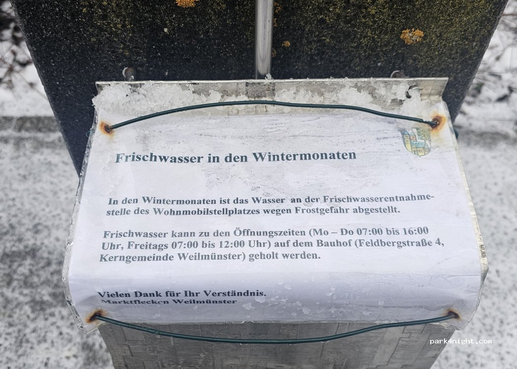 ganzjähriger kostenloser Stellplatz inkl. Ver-u. Entsorgung Müll mitten im Ort und dennoch recht ruhig. Durch die Beleuchtung fühlten wir uns auch zu dieser Jahreszeit sicher. Bitte Spendenbox füttern, da es anscheinend keine Alternativen in der Umgebung zzt. gibt. Platz ist gut besucht. Großes Lob an Weilmünster, hier ist man Willkommen.