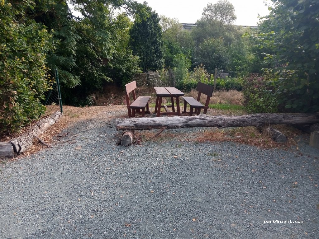 Watch out for the chain across the entrance. Gravel parking with no real shade except for one place under a tree. Two picnic tables in the corners. EHU €2 for 16 hours. Free services at the entrance. Difficult for grey drain. Only possible if van drain is on the outside edge. Black cassette drain is same as grey. Fresh water is cold and very strong pressure. Shops and restaurants close by.
