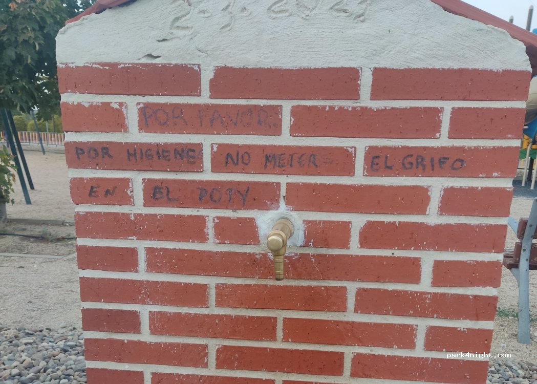 Hay que aclarar que solo hay un grifo, que no es higiénico (ideal 2 grifos, uno para limpiar Poty y otro para beber). Además, había un grupo de chavales (~13 años) haciendo ruido hasta altas horas, cortando el agua!! (un compi se dio cuenta que se corta en la parte de atrás del grifo, gracias!) y ensuciando los toboganes. Llamaré al Ayuntamiento. Las instalaciones están genial y no es justo!